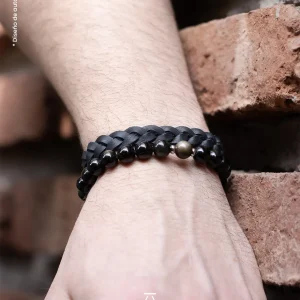 Pulsera de Obsidiana Dorada y Cuero Negro