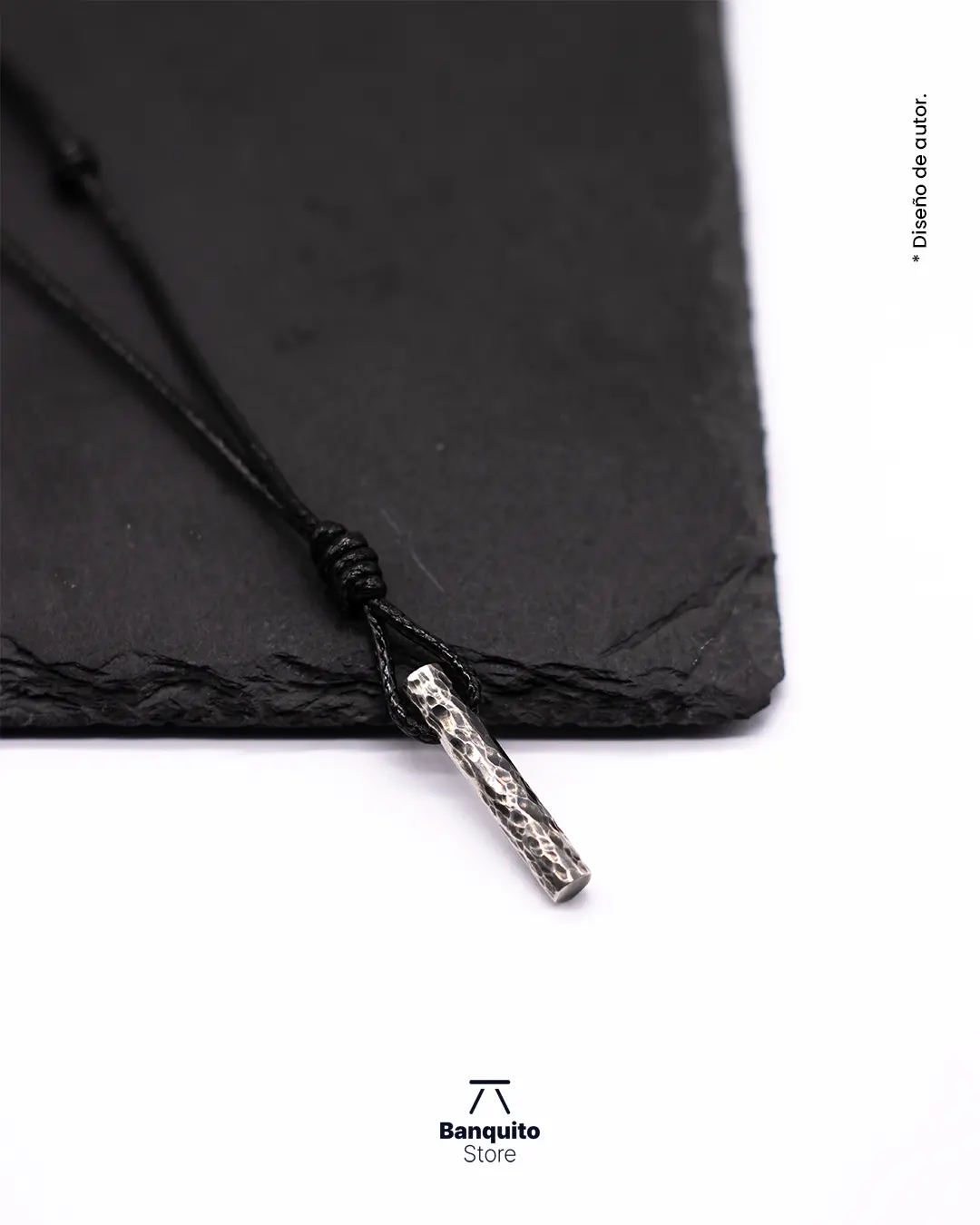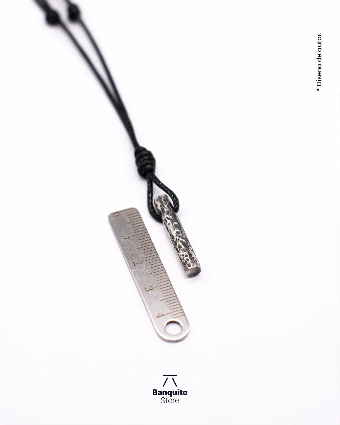 Este colgante cilíndrico de plata 950 maciza presenta una terminación martillada artesanal con efecto envejecido, logrando una estética más rústica y masculina sin perder elegancia.